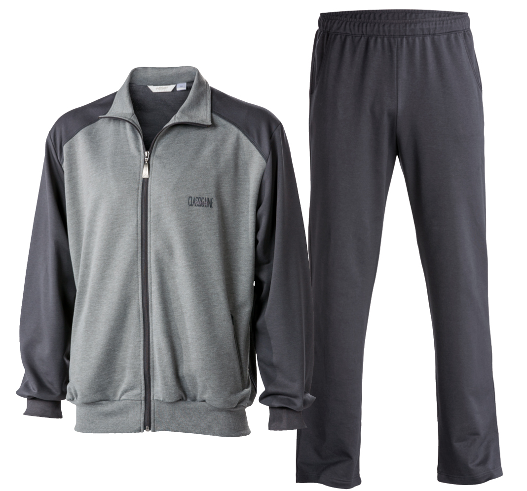 Die Jacke hat einen durchgehenden Reißverschluss und zwei Reißverschluss-Taschen. Sie ist mit einer Stickerei auf der Brust versehen. Ärmel- und Bundabschluß sind aus elastischen Bündchen. Die Hose hat 2 Einschubtaschen und einen dehnbaren Gummibund mit innenliegender Kordel zur Einstellung der Bundweite. Der offene Beinabschluss ist verdeckt gesäumt. Das pflegeleichte Material zeichnet sich durch Hautfreundlichkeit und Formstabilität aus.