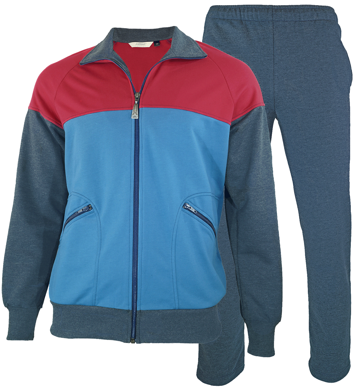 Die Jacke hat einen durchgehenden Reißverschluss und zwei Reißverschluss-Taschen. Ärmel- und Bundabschluß sind aus elastischen Bündchen. Die Hose hat 2 Seitentaschen und einen dehnbaren Gummibund mit innenliegender Kordel zur Einstellung der Bundweite. Der Beinabschluss ist verdeckt gesäumt. Das pflegeleichte Material zeichnet sich durch Hautfreundlichkeit und Formstabilität aus.
