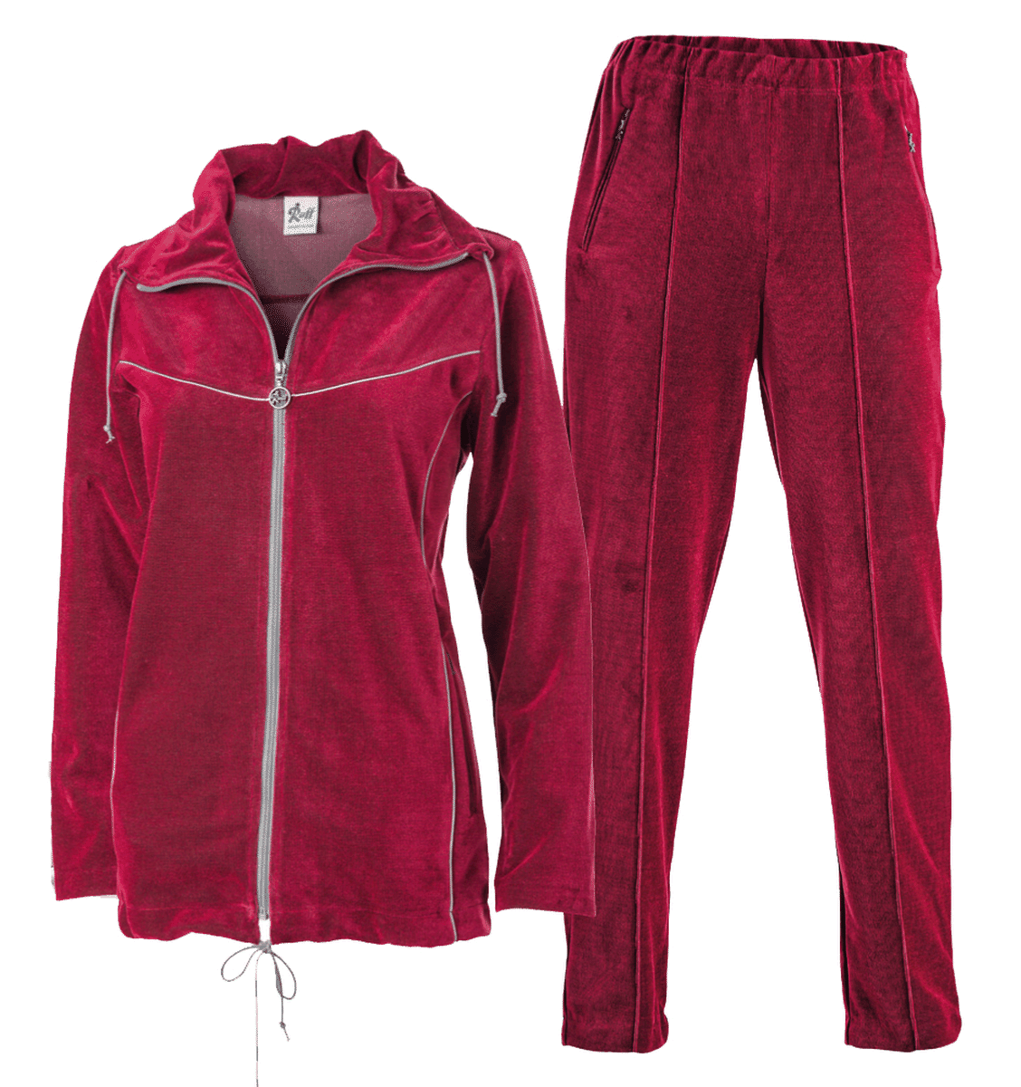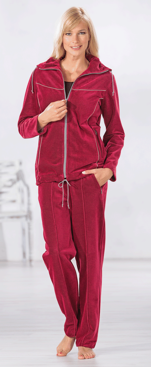 Die Jacke hat einen durchgehenden Reissverschluss, mit Ruff-Anhänger, zwei Paspel-Reissverschluss-Taschen mit Ruff Anhängern und ist mit farblich abgesetzten Doppelpaspeln versehen. Saumabschluss mit Kordelzug. Die Hose hat einen weichen, elastischen Softgummibund mit innenliegender Kordel und zwei mit Paspeln überdeckte Reißverschluss-Taschen mit Ruff-Anhängern. Permanente Bügelfalte durch elastische Biesenhaht, Beinabschluss mit verdeckter Saumnaht. Die Qualität mit Klimafunktion ist äussert hautfreundlich, temperaturausgleichend und bietet höchsten Tragekomfort. Das pflegeleichte Material ist nach Öko-Tex-Standard 100 zertifiziert.